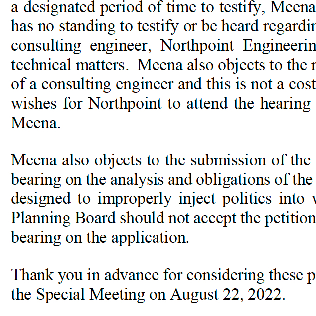 Johnson went on to say that Meena objects to North Point attending the hearing because “that is not the role of a consulting engineer.”